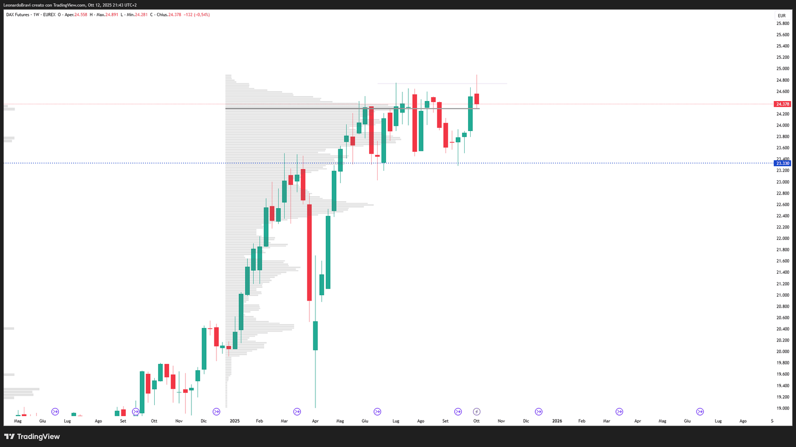 Qualora dovesse rompere strutture di prezzo a ribasso (zona dei 23.000 punti), scenario che vedo più probabile guardando anche il grafico settimanale che continua a fare rifiuti su rifiuti ai massimi, aspetterei che il prezzo scenda fino a nuovo pattern di accumulo di lungo periodo. Invece, qualora dovesse rompere i massimi con forza a rialzo questa settimana rimane valido il pattern rialzista segnalato settimana scorsa.