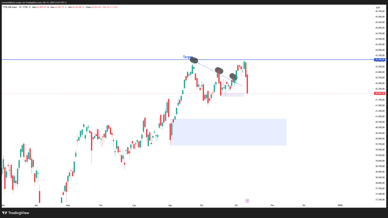 Il nostro indice locale era quasi arrivato al target preposto nell’analisi di settimana scorsa, mancandolo per pochissimi punti. Le forti chiusure ribassiste di giovedì e venerdì, caratterizzate da importanti candele negative, fanno presagire l’inizio di un’inversione di rotta anche sul medio-lungo termine, anche a giudicare dalla chiusura della candela settimanale avvenuta questo venerdì appena passato. Anche se per il momento non sono state rotte ancora strutture di mercato rilevanti al ribasso, come la zona dei 42.000 punti. Qualora si dovesse perdere a ribasso anche quella zona, inizierei a considerare un movimento ribassista di lungo periodo.