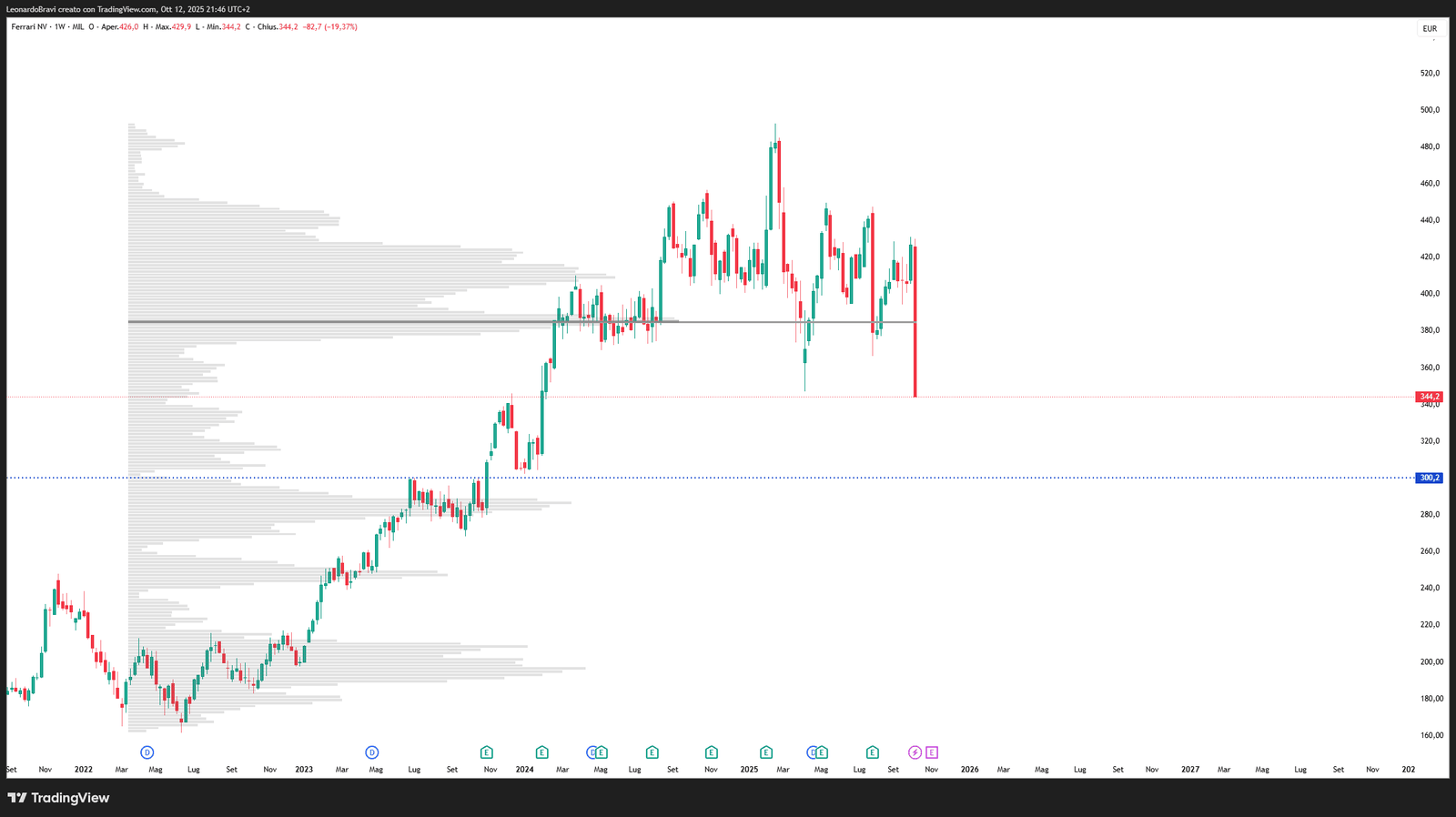 La mia visione su Ferrari (Ticker: RACE) è ribassista, a giudicare anche dalla chiusura settimanale non valuterei minimamente un’operazione rialzista sul breve-medio periodo. Inizierei a valutare qualcosa solo dopo che il prezzo dovesse arrivare a 300 Euro per azione e solo se dovesse il grafico iniziare a darmi un pattern rialzista.